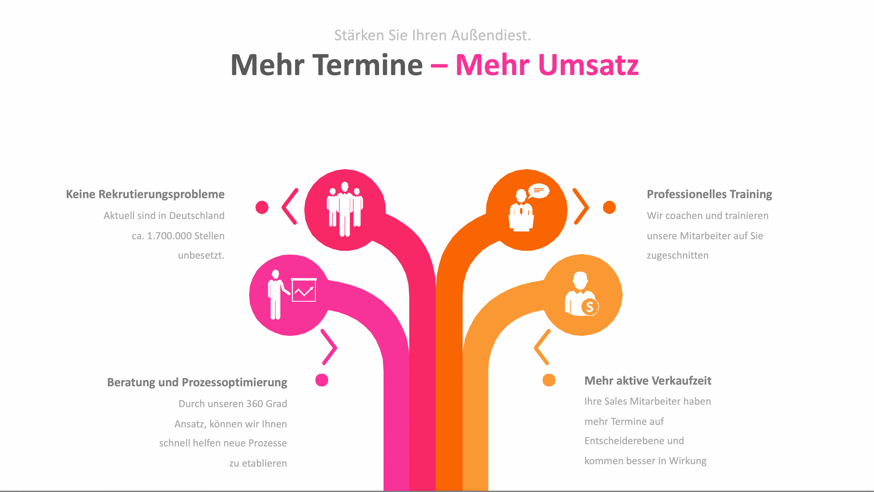 Gleichzeitig steht Ihnen unser erfahrenes Team aus Vertriebs- und Service-Profis zur Seite: Wir übernehmen für Sie die Terminierung, kümmern uns um die Leadgenerierung und bieten Ihnen individuelles Consulting, damit Ihre Vertriebsstrategie nachhaltig erfolgreich ist.